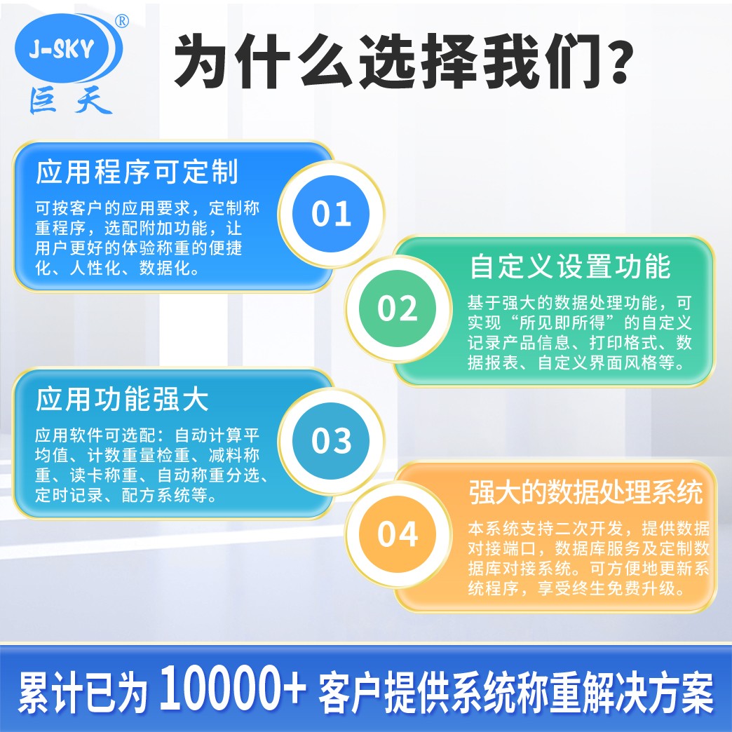 高精度與多量程:巨天智能秤采用高精度傳感器,內碼高達1,000,000,分度值精細,確保大小料稱重均精準無誤。系統支持單量程、雙量程等多種模式,靈活適配不同稱重范圍的需求。